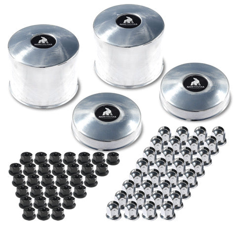 Polished aluminum caps with new lug nuts and stainless steel nut covers. The caps will be installed before any lug nuts are attached. The lip at the base of the cap will be held on by the edge of the washer of the lug nut for a very secure fit. No more caps flying off as you drive down the road.